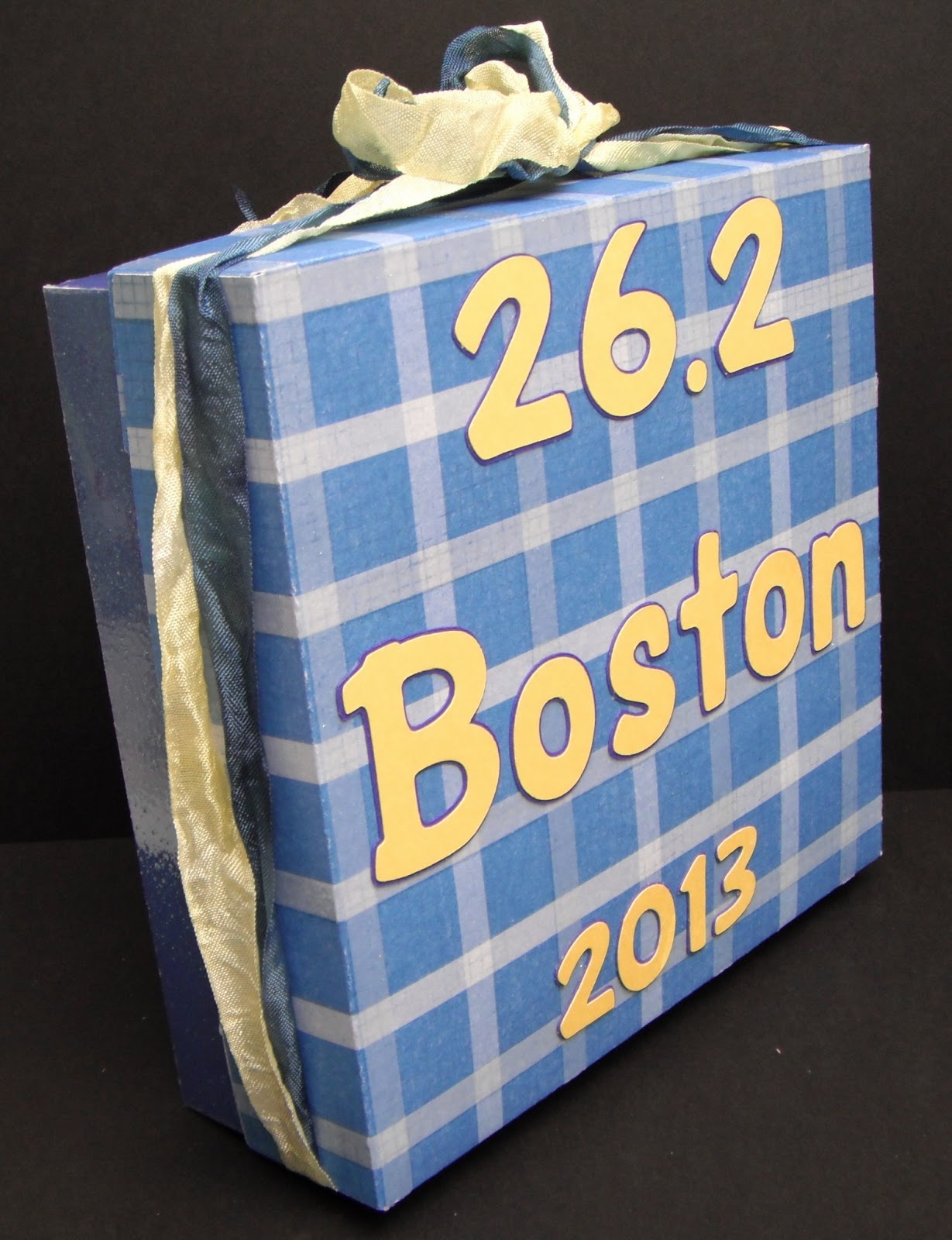 A number of runners from our running group went to the finish line of the local marathon to cheer the ladies on as they "finished" their race. I wanted to do something a little special for my friend and decided to make her a few cupcakes, frosting them in blue and yellow, the colors of the Boston Marathon. I made a box for the cupcakes using the Sweet Tooth Boxes cartridge, and personalized it a bit using the Pooh Font cartridge. I tied blue and yellow crinkle ribbon around the lid because I thought it needed a little something.